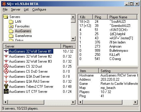 ServerQuery is a free, light-weight dedicated server browser; allowing you to browse and connect to most popular games that utilise a dedicated server model. Unlike its competitors, ServerQuery comes equipped with lists of servers targetted to the Australian/NZ gamer; many of these lists are officially supported by the ISP providing the servers.